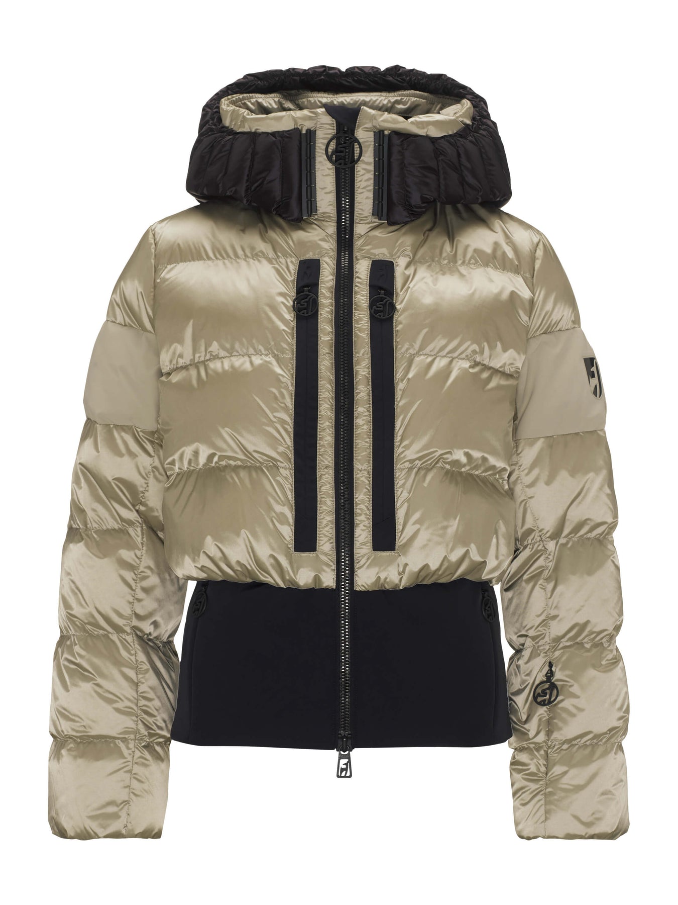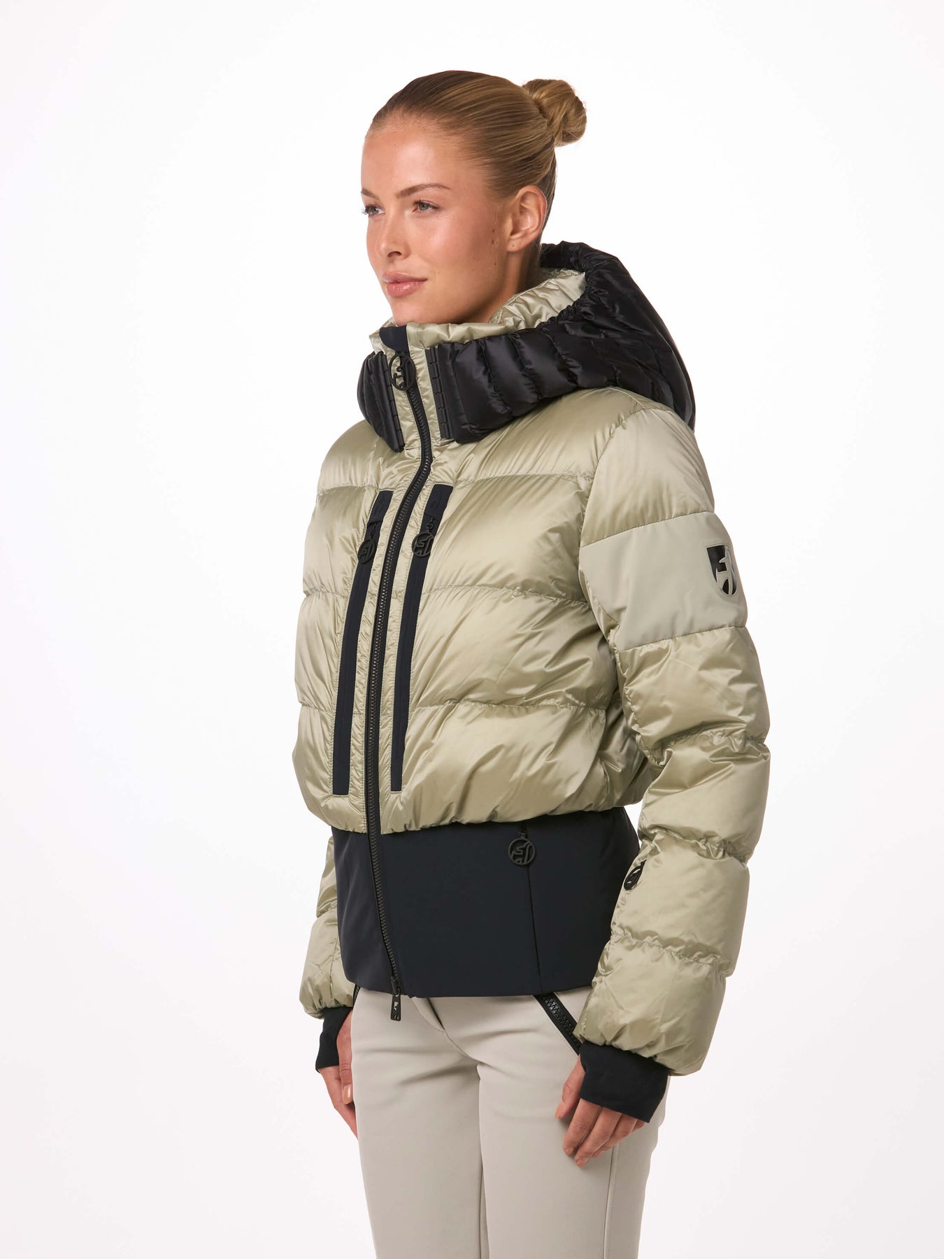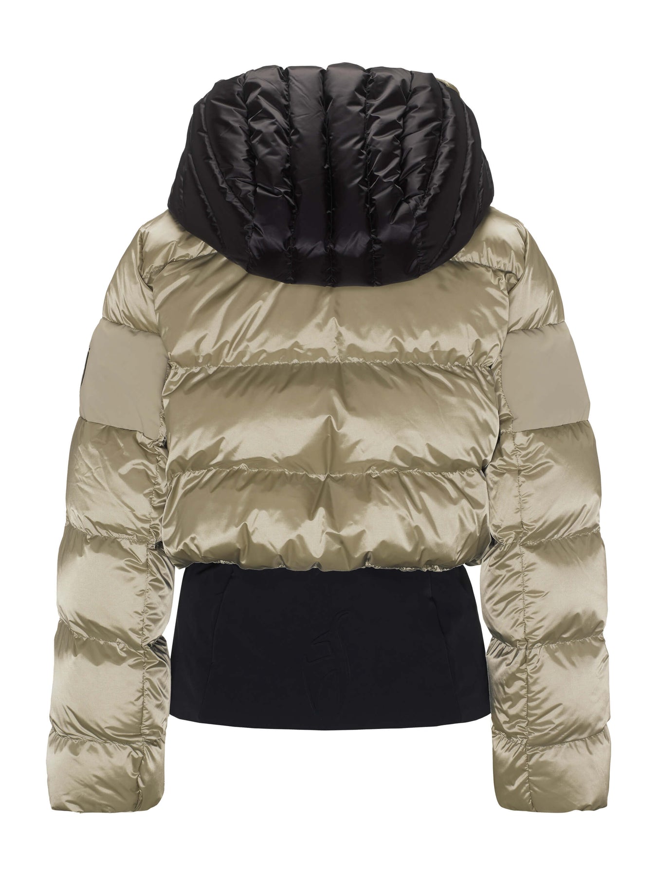 Glamour meets function. The Shiny Pearl fabric mixed with our Premium 4-way Stretch gives you the modern look without loosing any performance. 750 cuin fill power keeps you warm, even on the coldest winter days. The BERNADETTE SPLENDID shows progressive detailing with YKK® 2-way METALUXE® zippers, new engineered logos and an exclusive designed hood for the cold days.