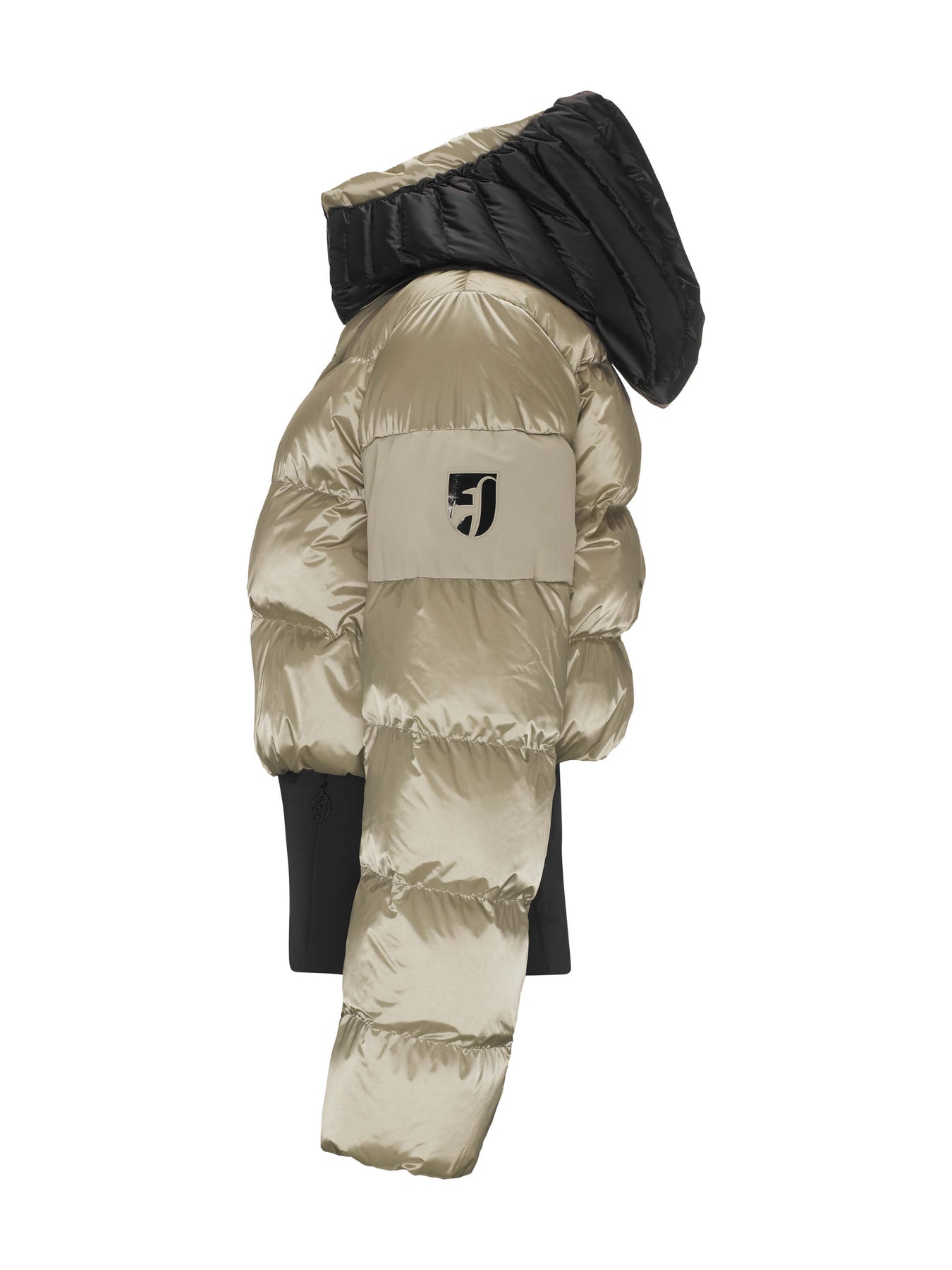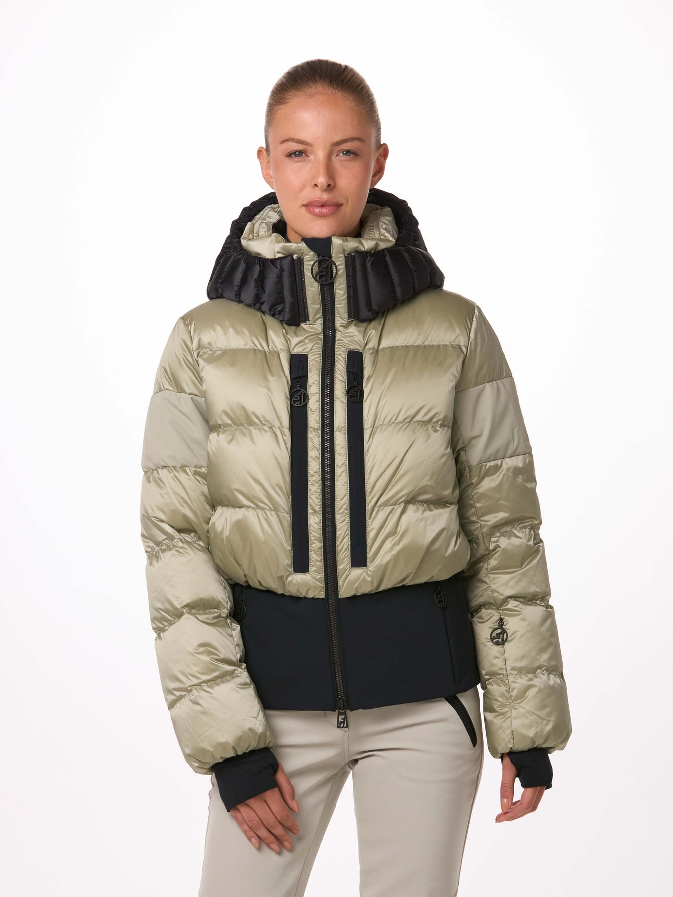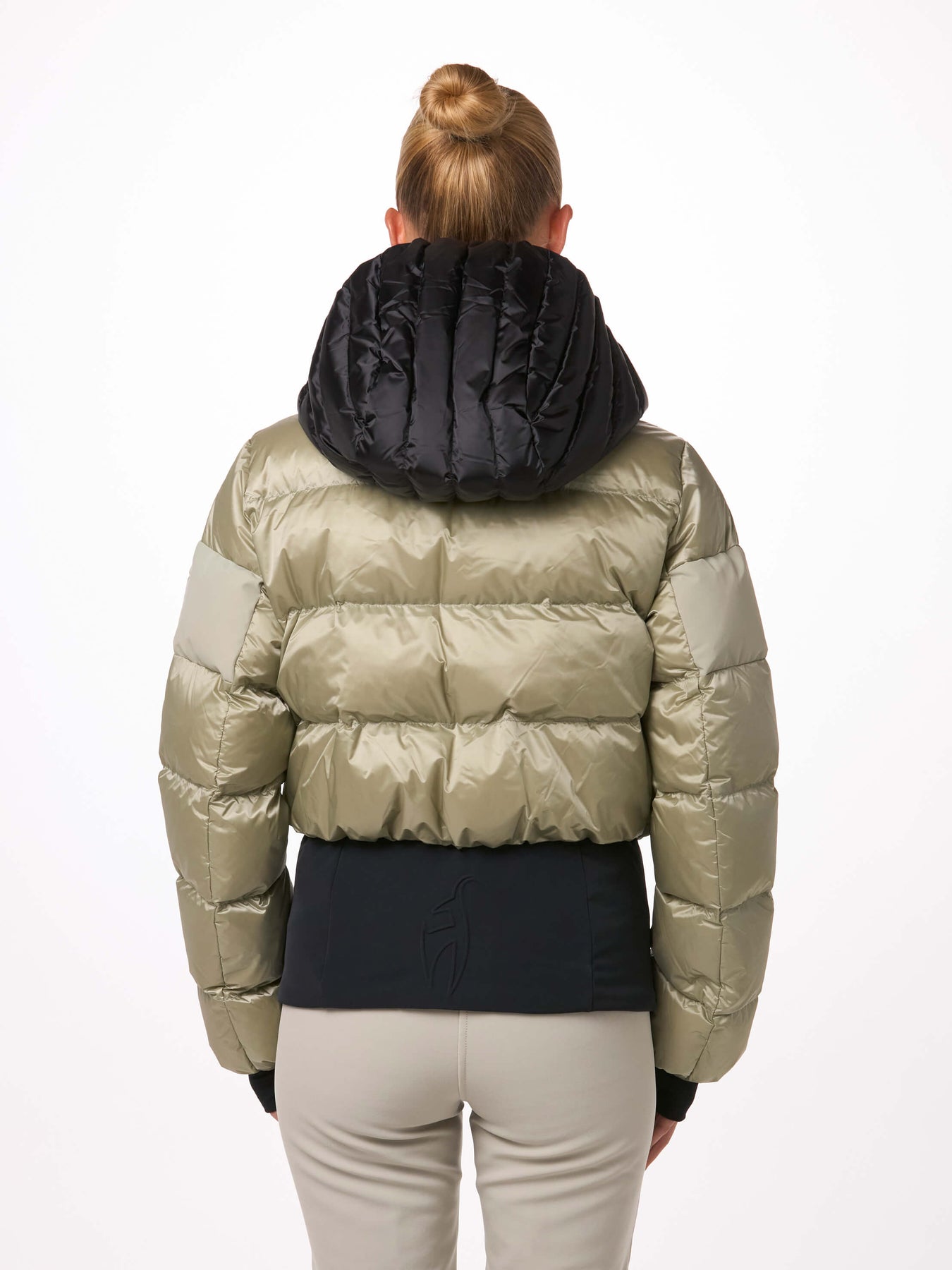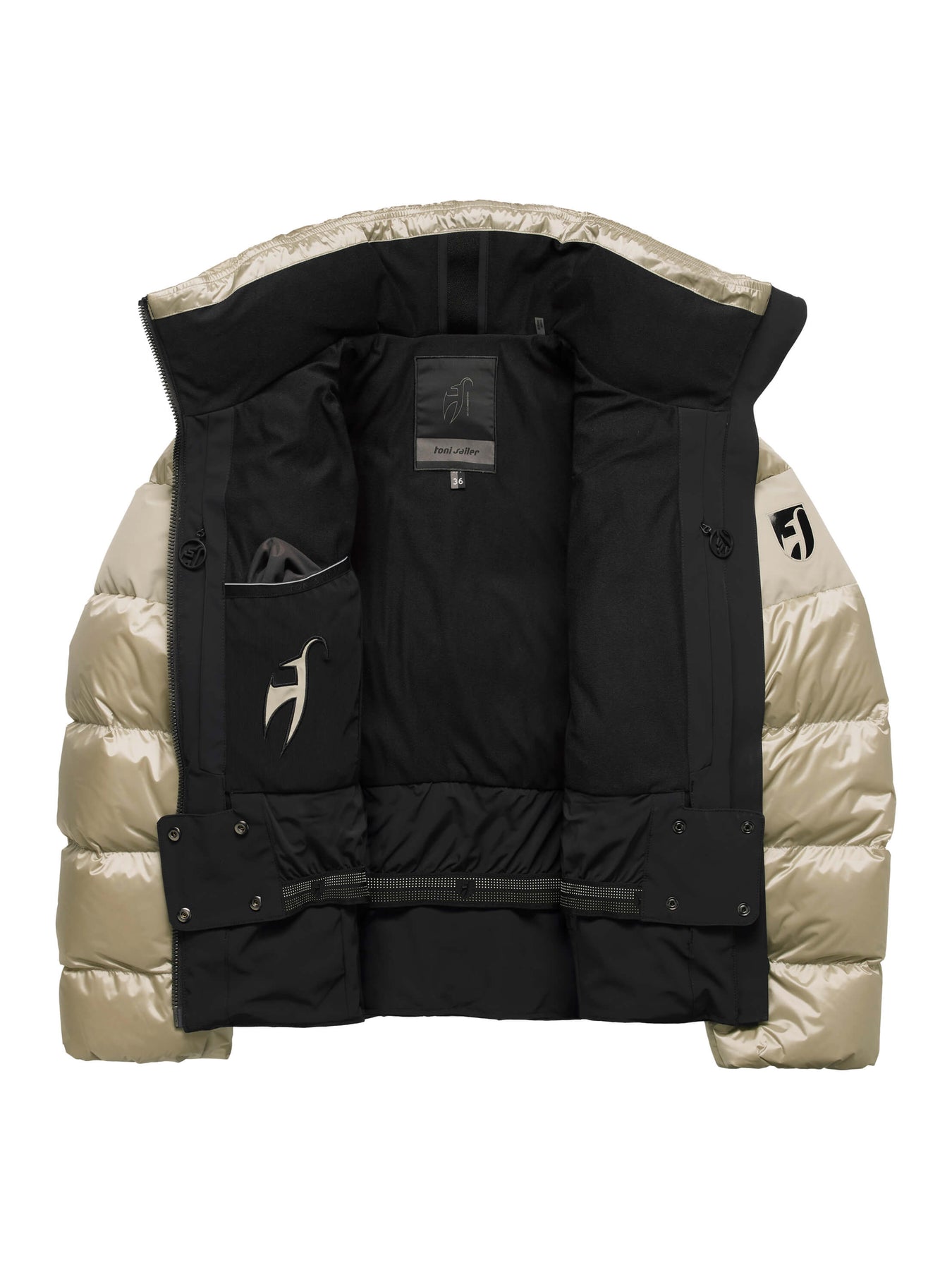 Glamour meets function. The Shiny Pearl fabric mixed with our Premium 4-way Stretch gives you the modern look without loosing any performance. 750 cuin fill power keeps you warm, even on the coldest winter days. The BERNADETTE SPLENDID shows progressive detailing with YKK® 2-way METALUXE® zippers, new engineered logos and an exclusive designed hood for the cold days.