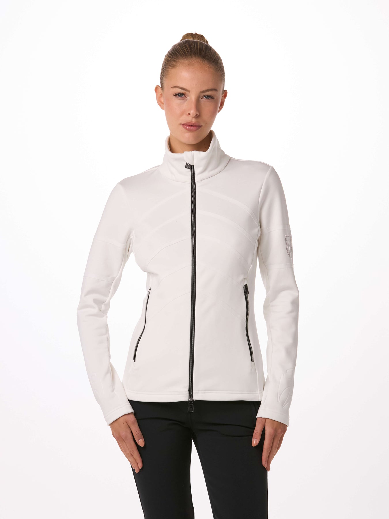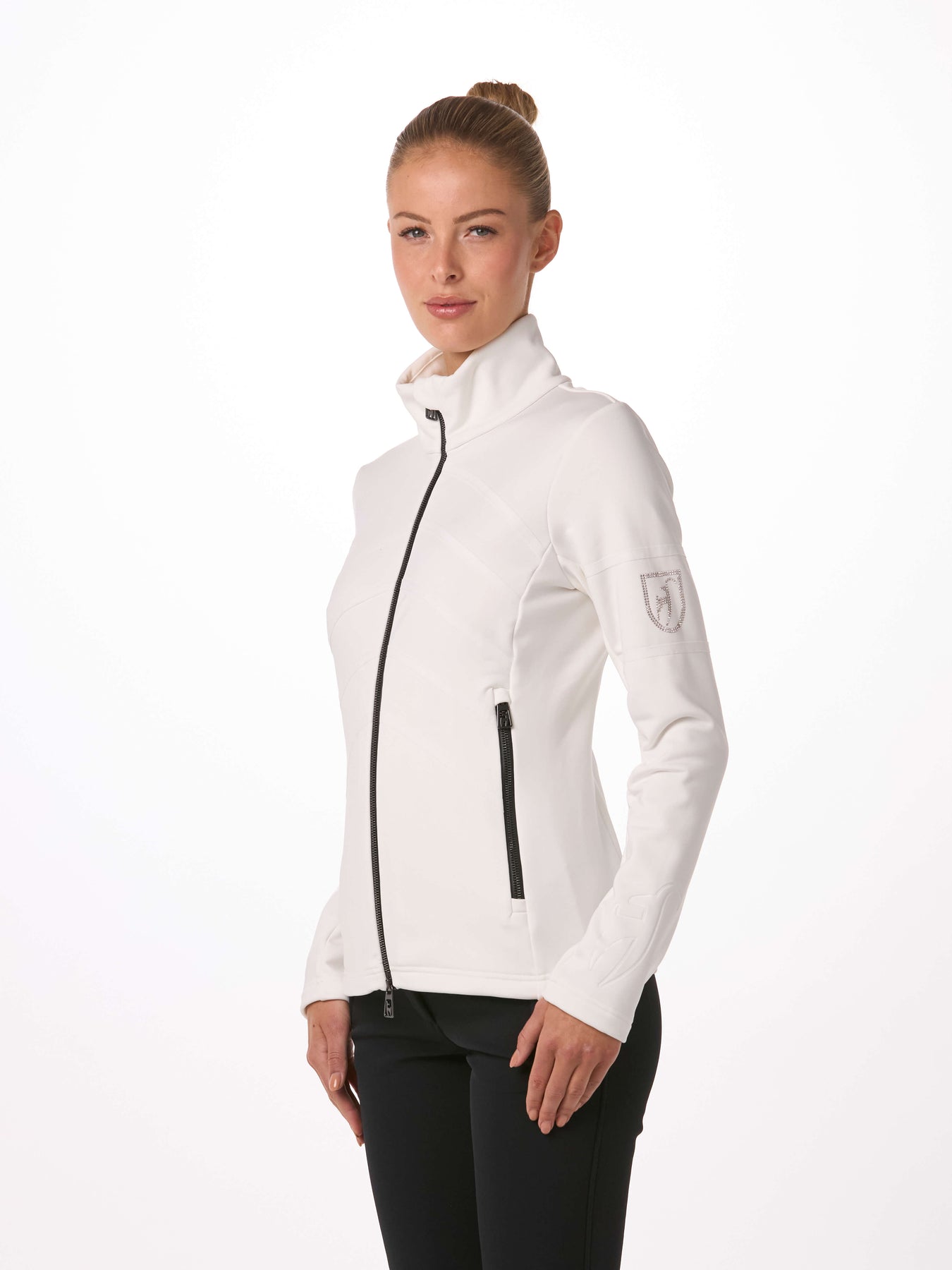 Sophisticated look for the slope or the golf course. The SUE mid layer jacket combines technical taping details with a luxury embellished Swarovski® crystals logo on the sleeve. Made for active moments, the SUE keeps you warm and dry. 100% body climate control.