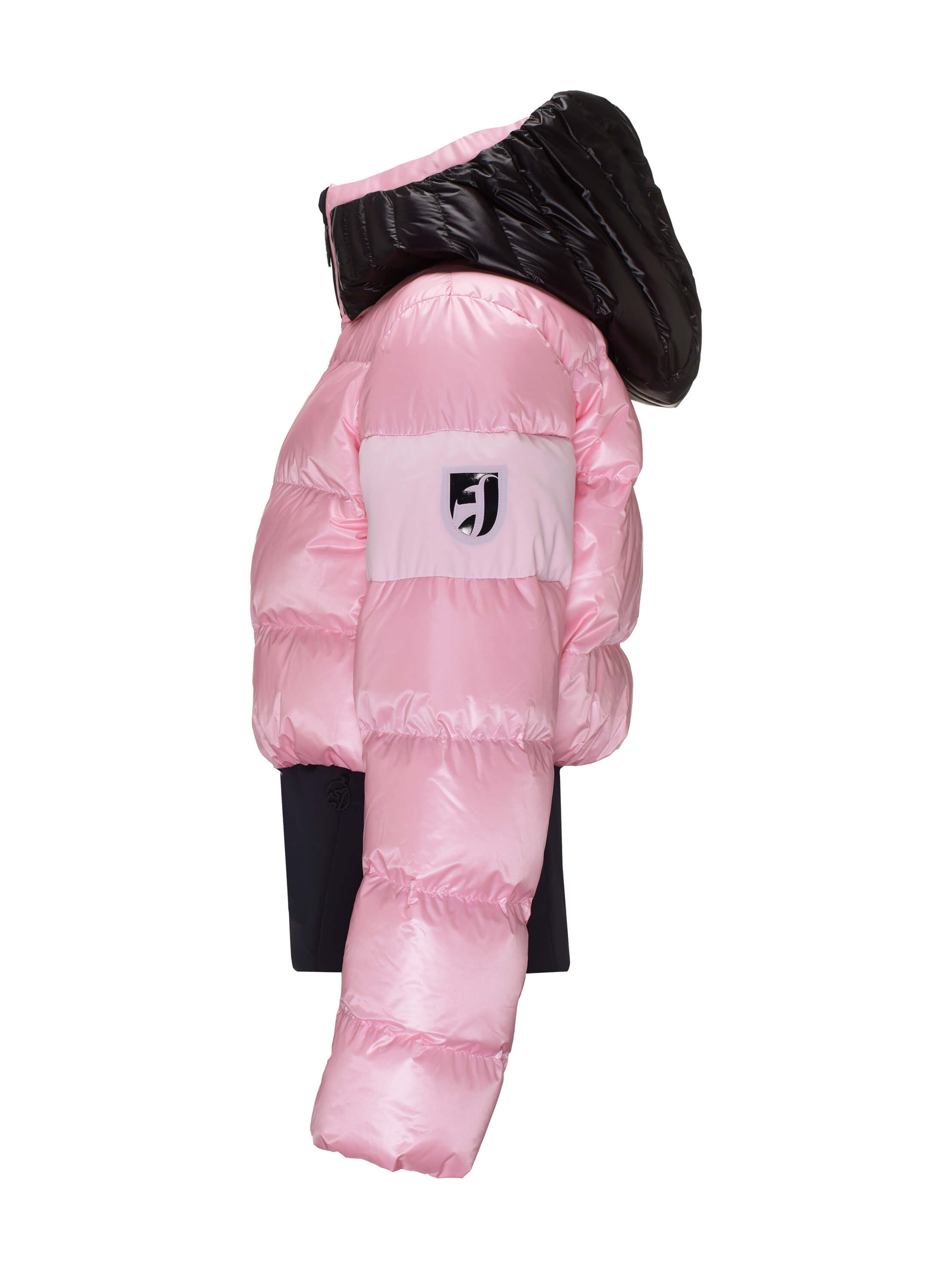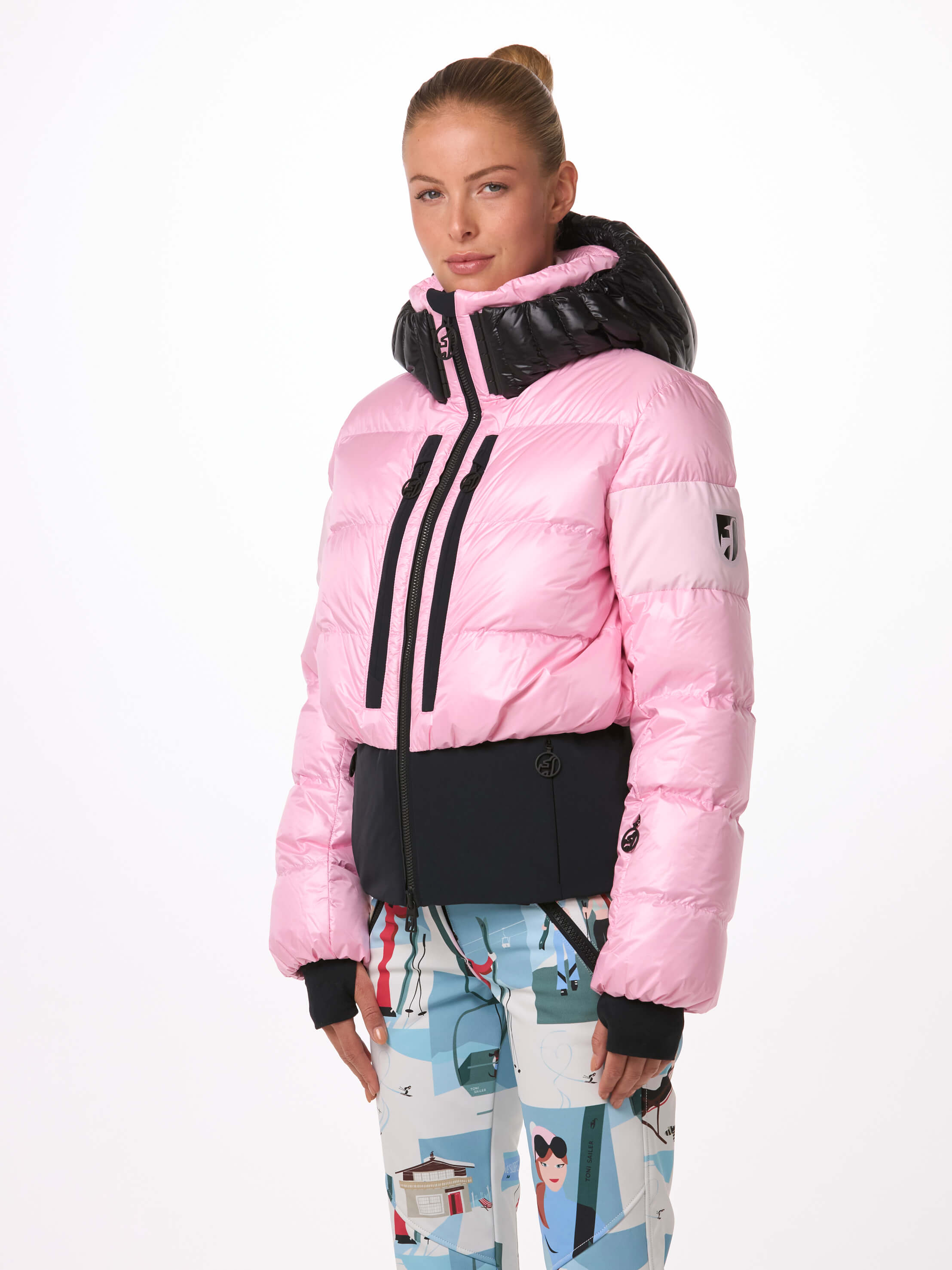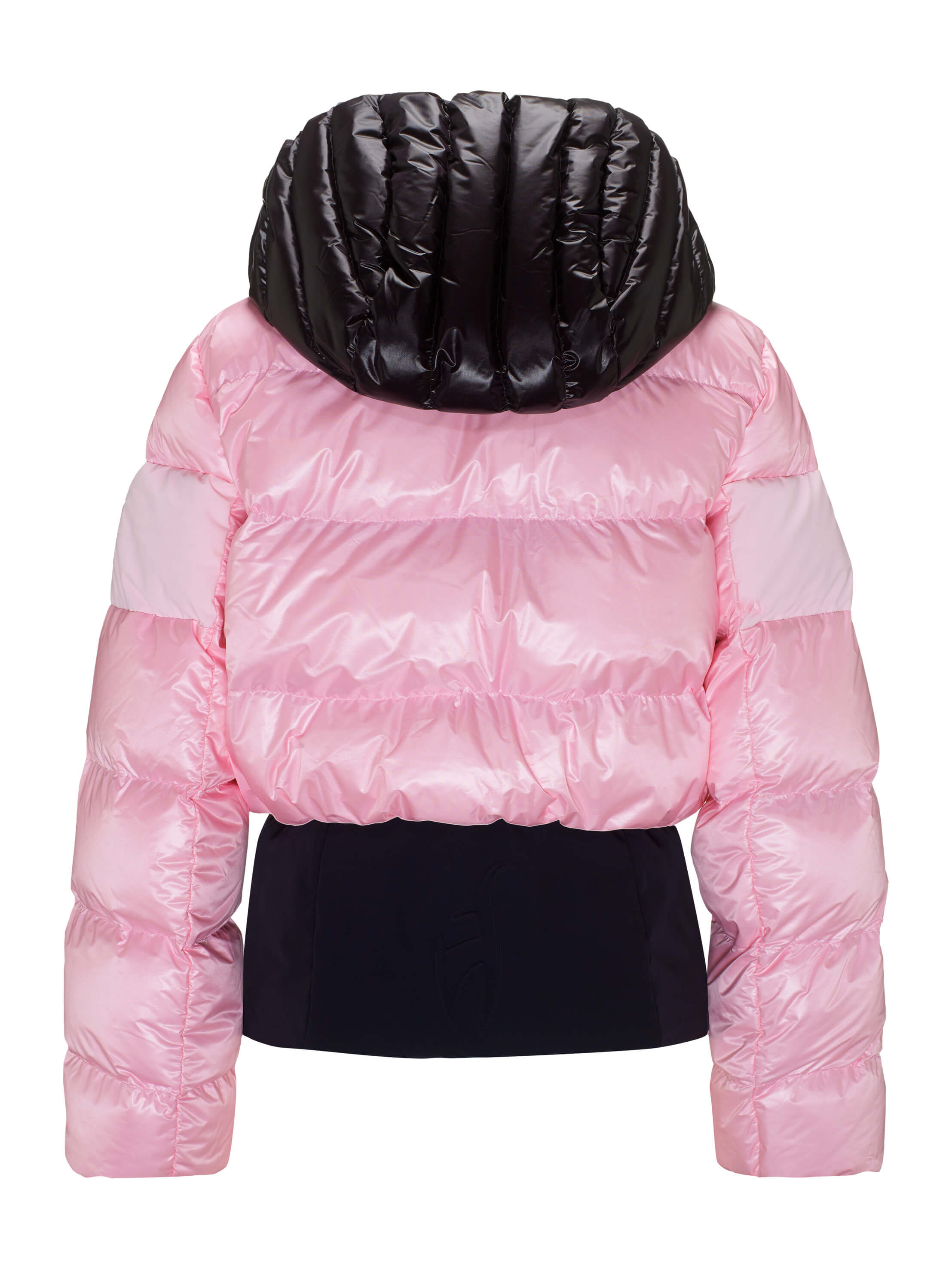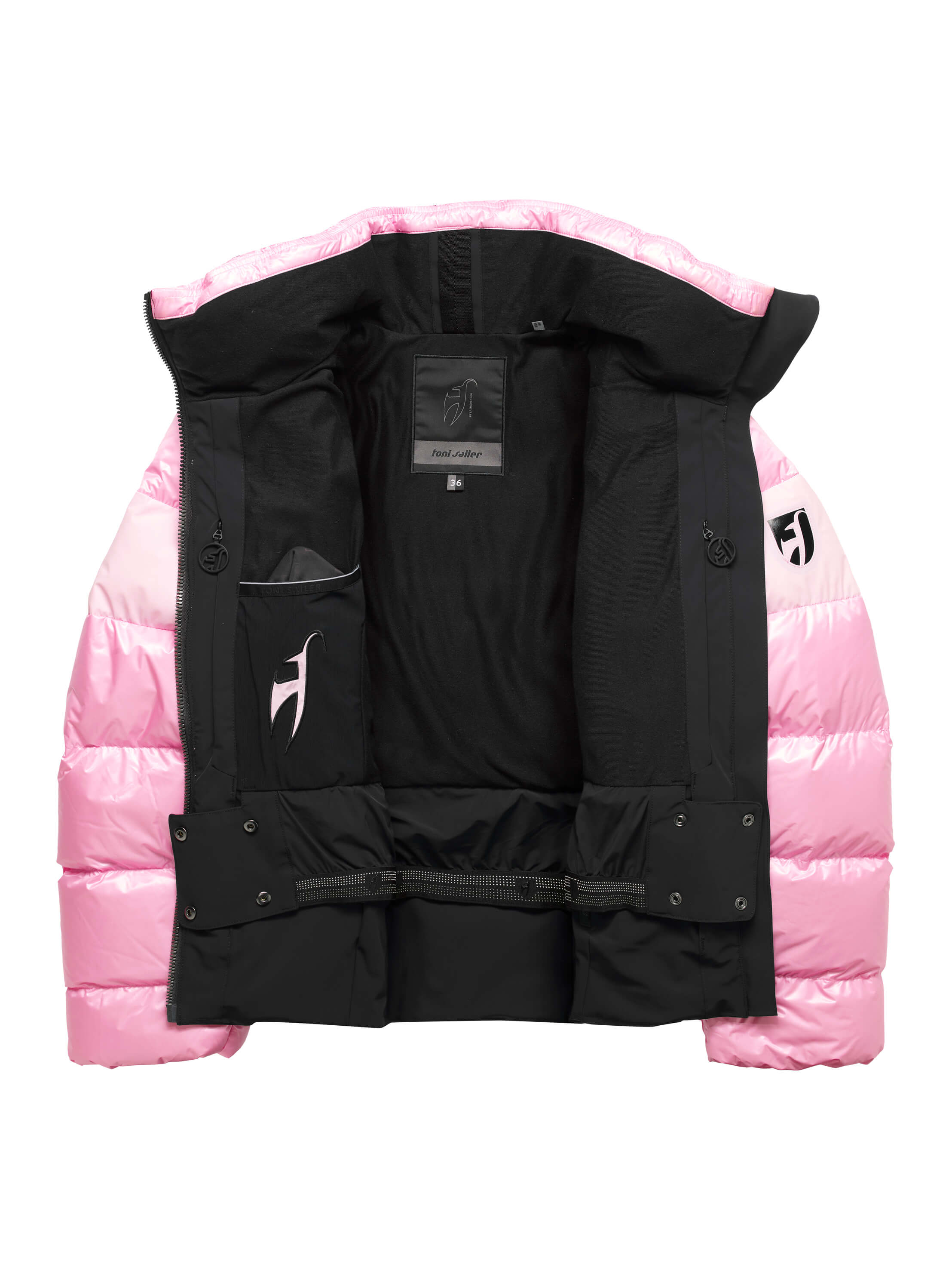 Light, warm and fashion. With 100% certified down insulation the BERNADETTE jacket creates a very fashy puffy look on the slopes and in the resorts. Loose fit optic meets slim fit! The YKK® 2-way METALUXE® front zipper, the glossy bonded logos and the special shiny chamber look fabric for the hood make the BERNADETTE so progressive.