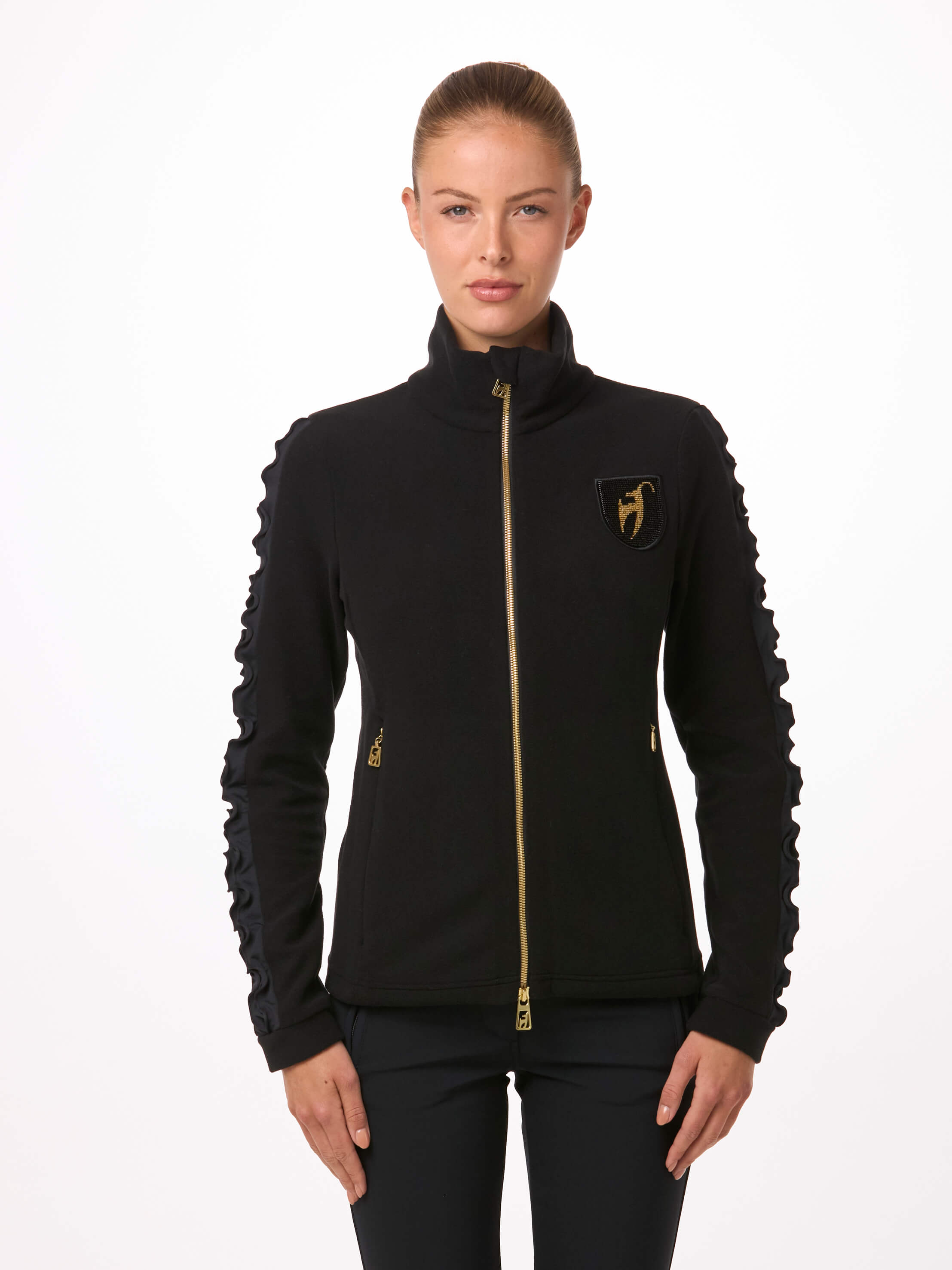 Golden Zippers, unique handcrafted pearl patch - this is pure luxury. The CARINNE GOLD PEARL mid layer jacket is part of our special edition and matches perfectly with our SASHA SPECIAL jacket. The Italian power stretch fabric supports your body climate control at its best and gives you total freedom of movement.