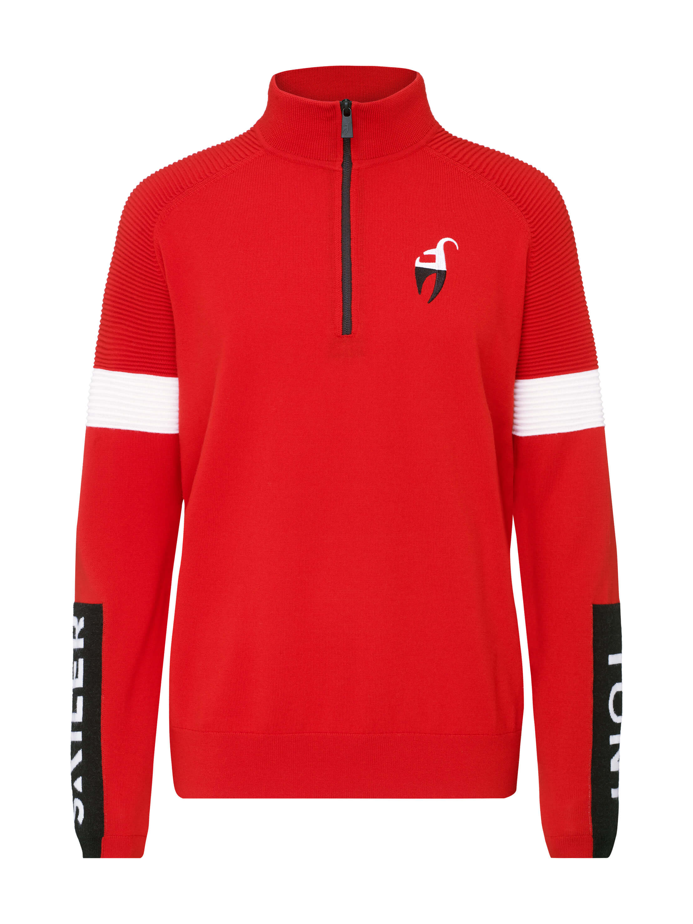 The ERNSTL men’s merino sweater is perfect for both skiing and leisure. The extra fine merino wool is breathable, moisture-wicking, and temperature-regulating. For better freedom of movement, the sweater is designed with raglan sleeves. The stand-up collar protects the neck from wind, while the YKK zipper allows for individual ventilation. Various color-contrasted details give the knit sweater a sporty character. The smocked sections on the shoulders and upper arms complement the Toni Sailer style, making it a perfect match with the KILIAN men’s ski pants.