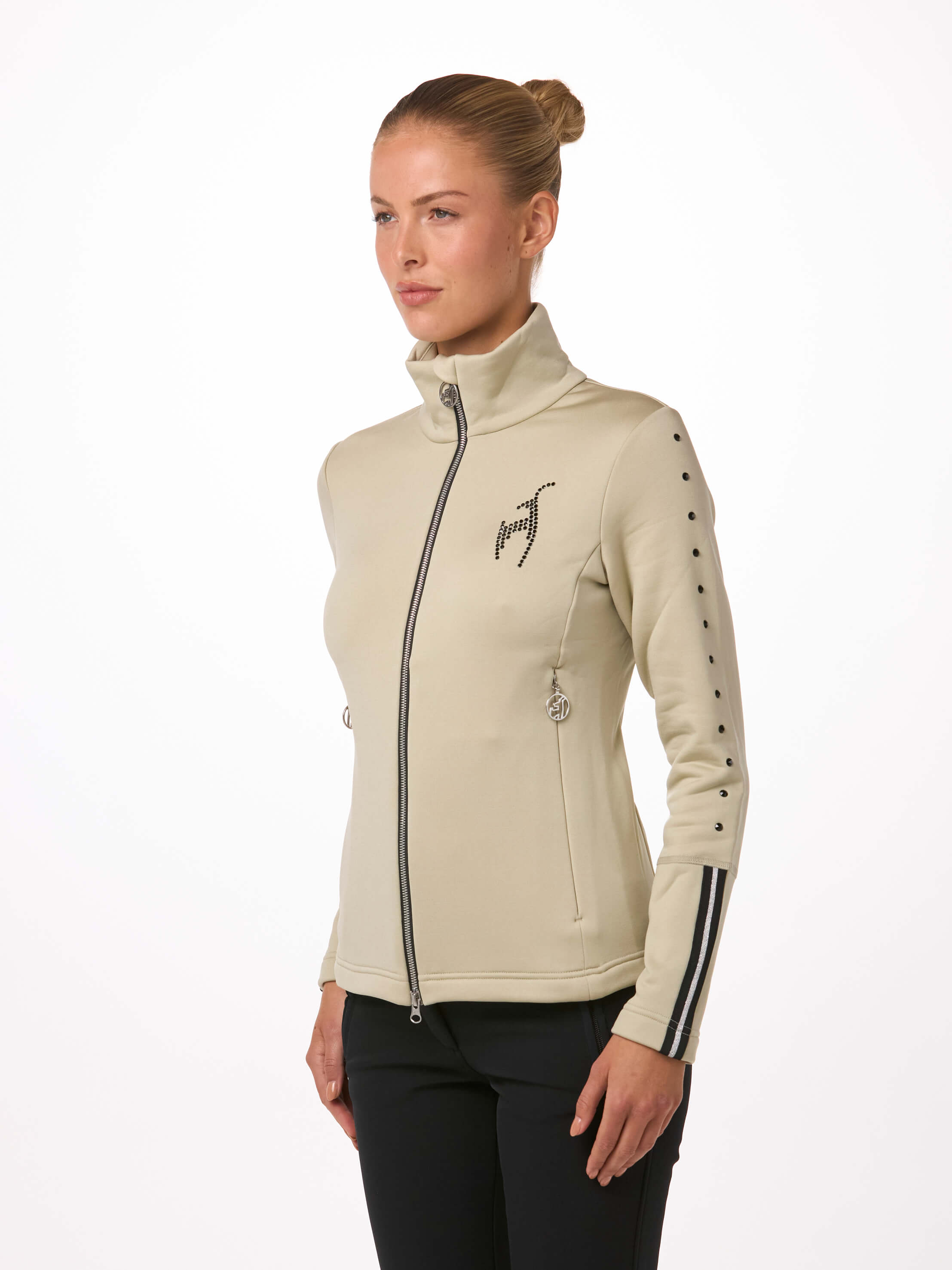 Embellished with Swarovski® crystals – featuring the gams logo on the chest and embellishments along the sleeves, the KATHI SPECIAL women’s mid layer is crafted from exquisite Italian Power Stretch. The elastic and quick-drying fabric retains warmth while efficiently wicking away moisture. The front is equipped with the practical and stylish YKK 2-way METALUXE® Mirror Zipper, and the side pockets are securely sealed with seamless zippers. Silver-toned stripes at the sleeve cuffs add an extra touch of luxury to this light jacket.