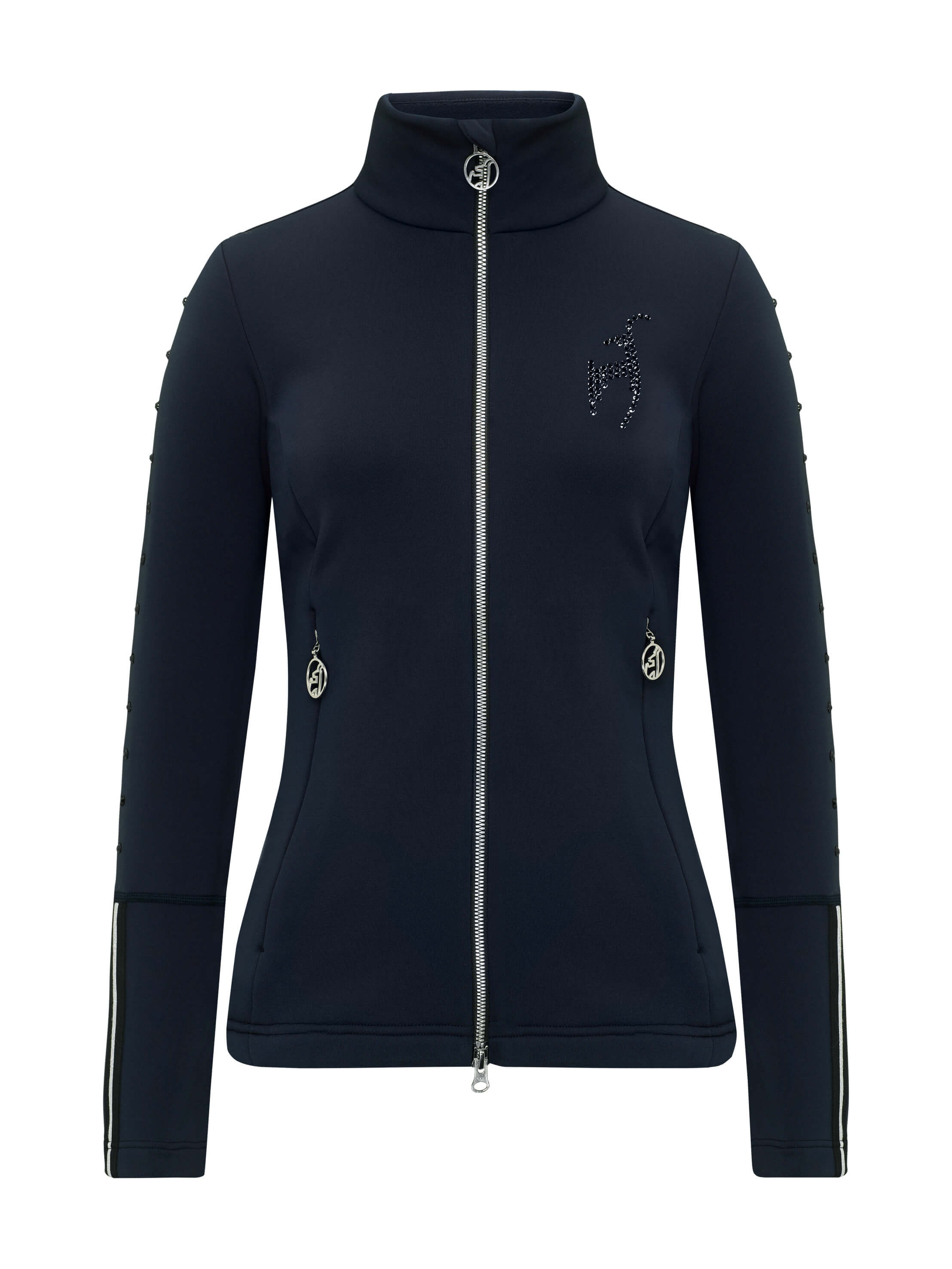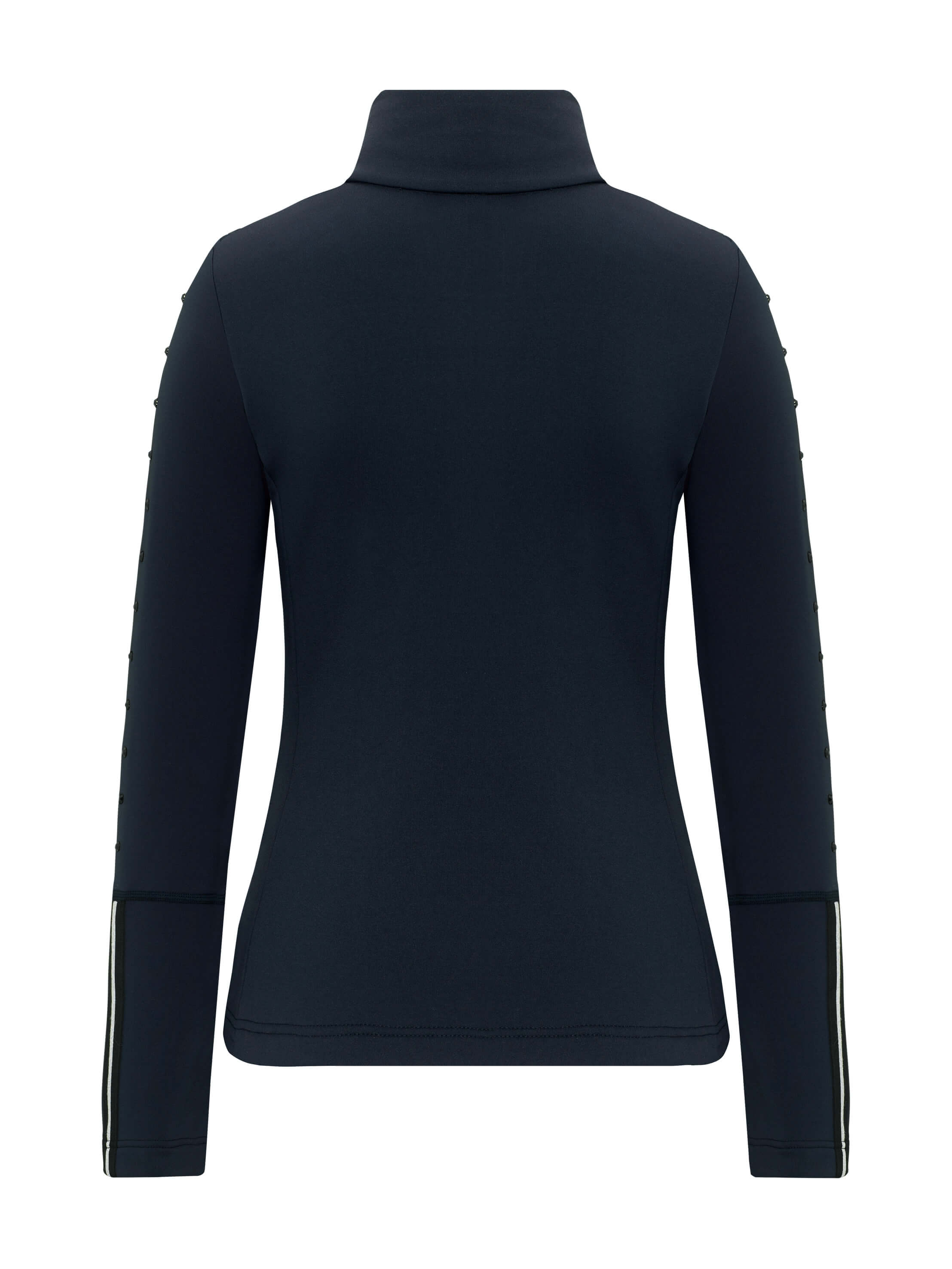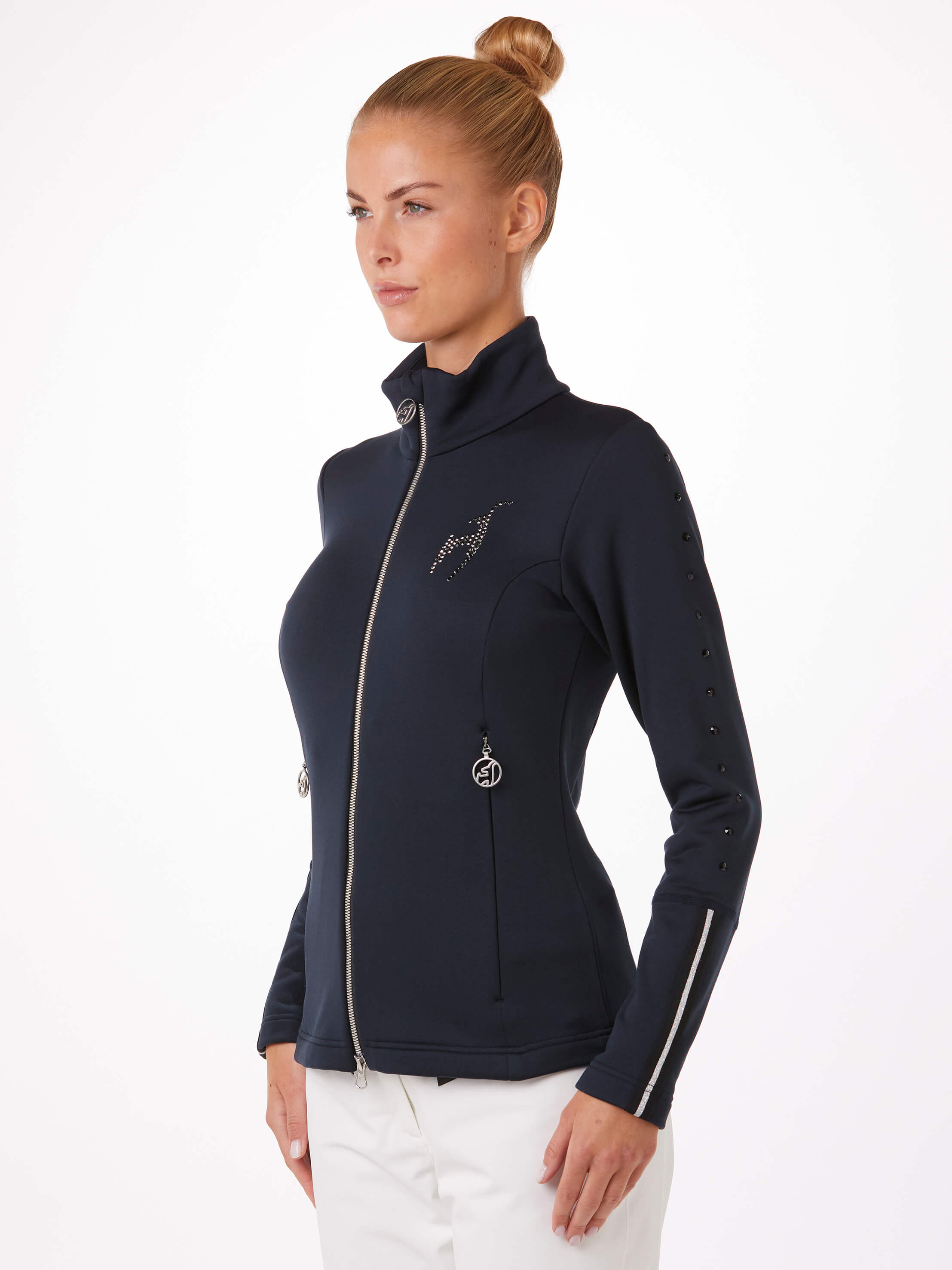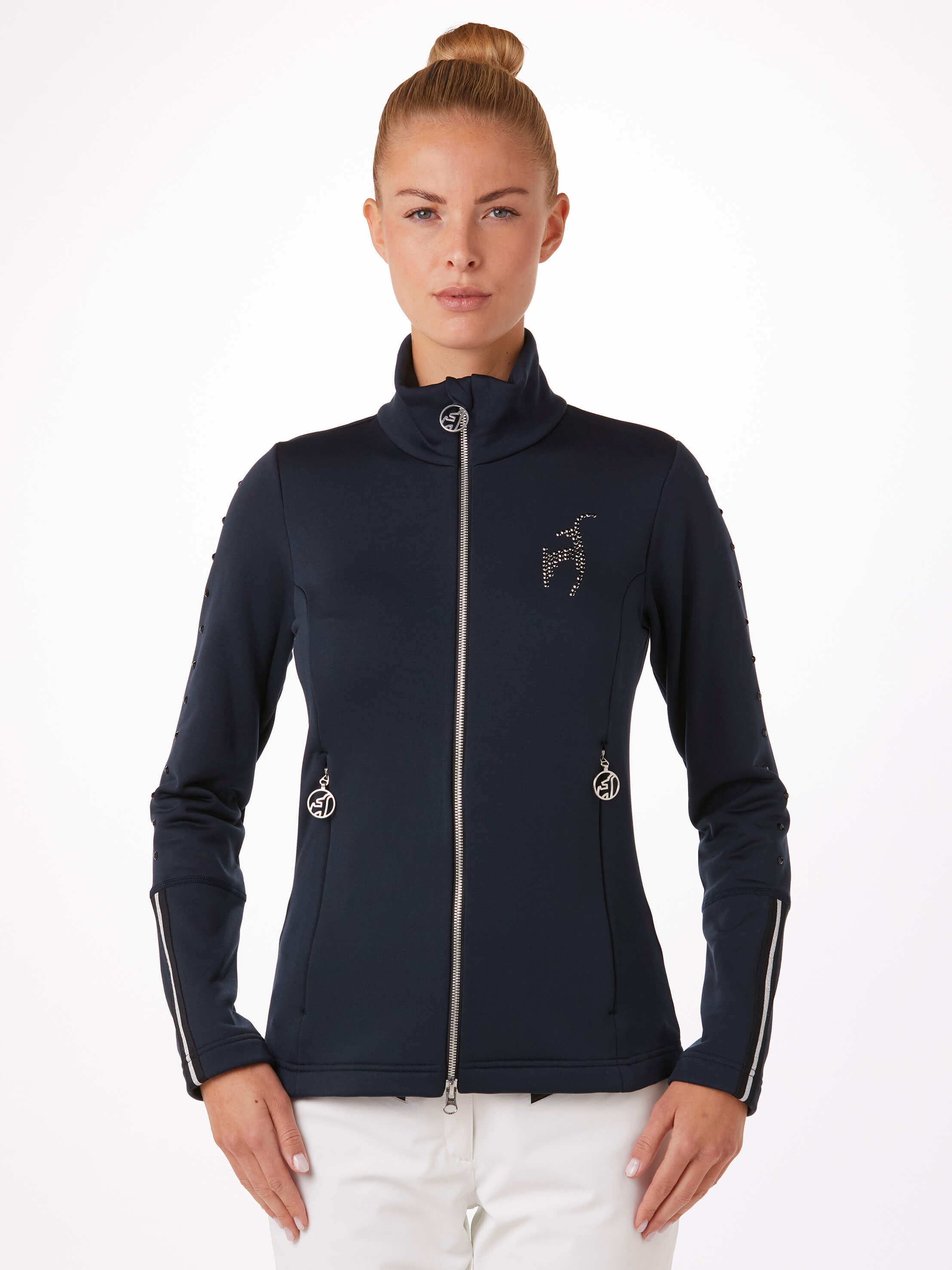 Embellished with Swarovski® crystals – featuring the gams logo on the chest and embellishments along the sleeves, the KATHI SPECIAL women’s mid layer is crafted from exquisite Italian Power Stretch. The elastic and quick-drying fabric retains warmth while efficiently wicking away moisture. The front is equipped with the practical and stylish YKK 2-way METALUXE® Mirror Zipper, and the side pockets are securely sealed with seamless zippers. Silver-toned stripes at the sleeve cuffs add an extra touch of luxury to this light jacket.