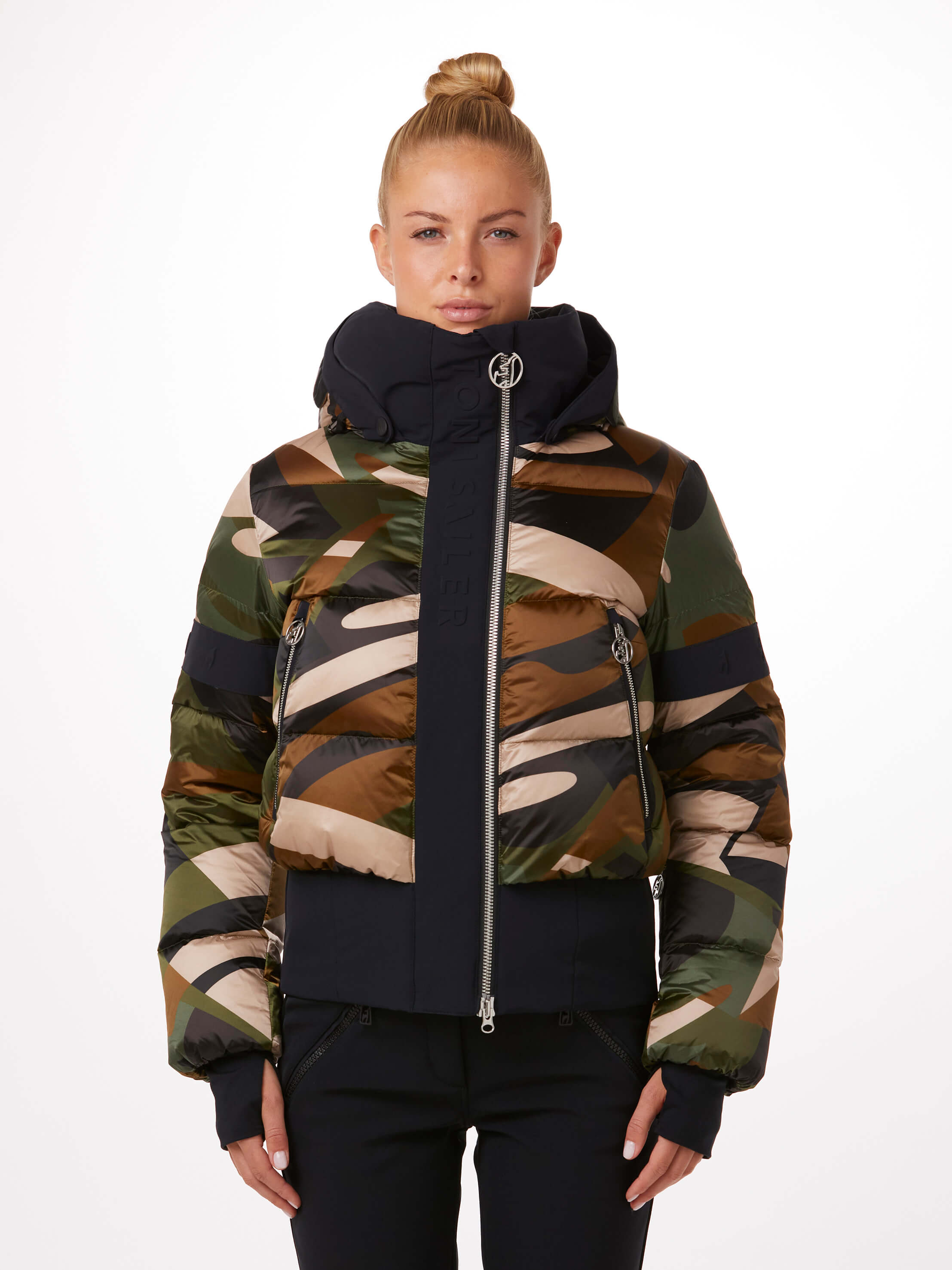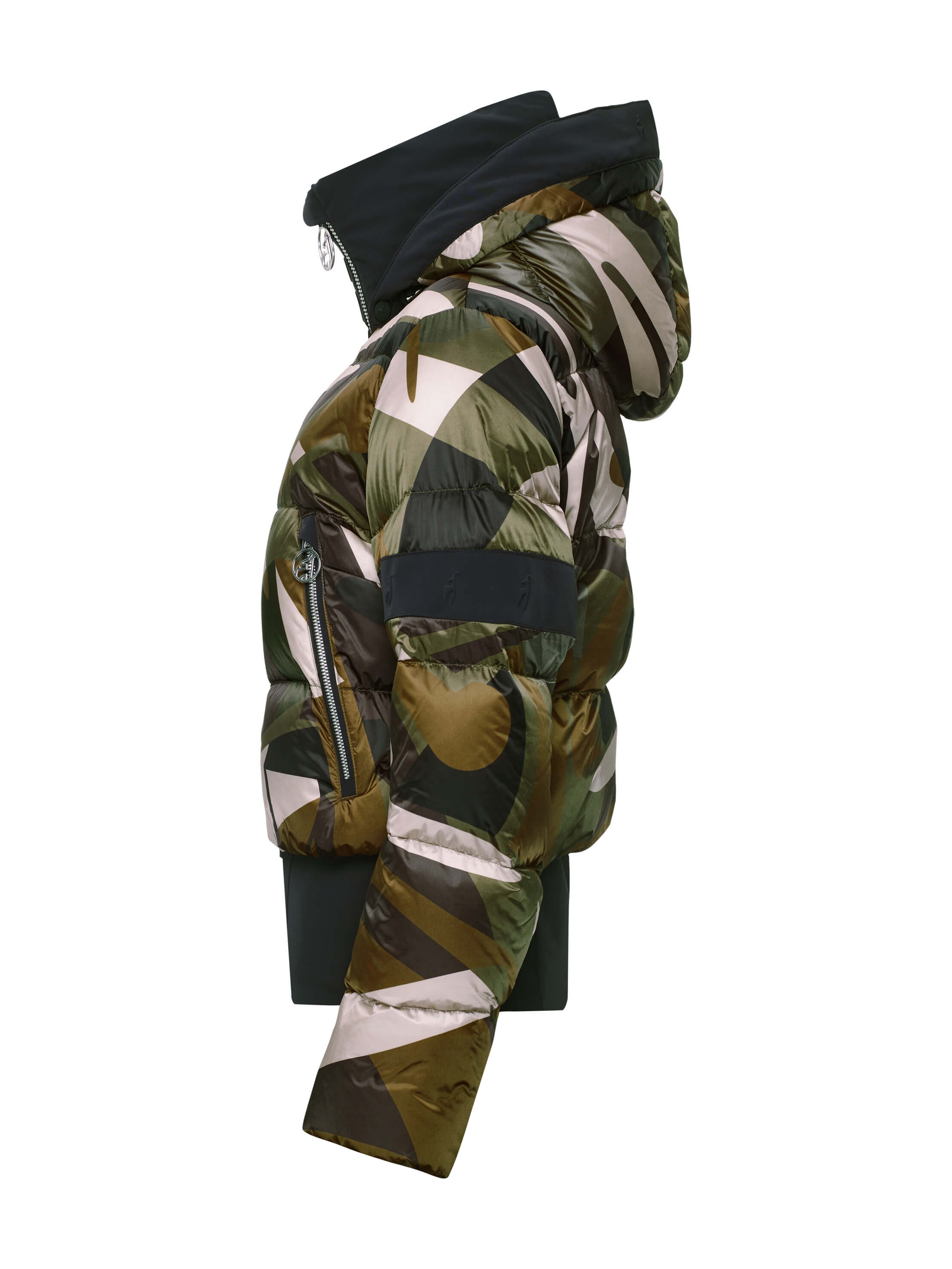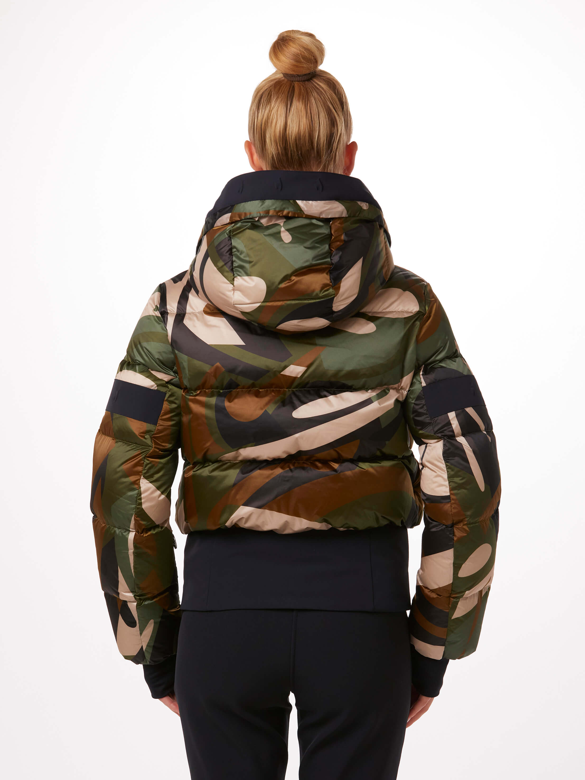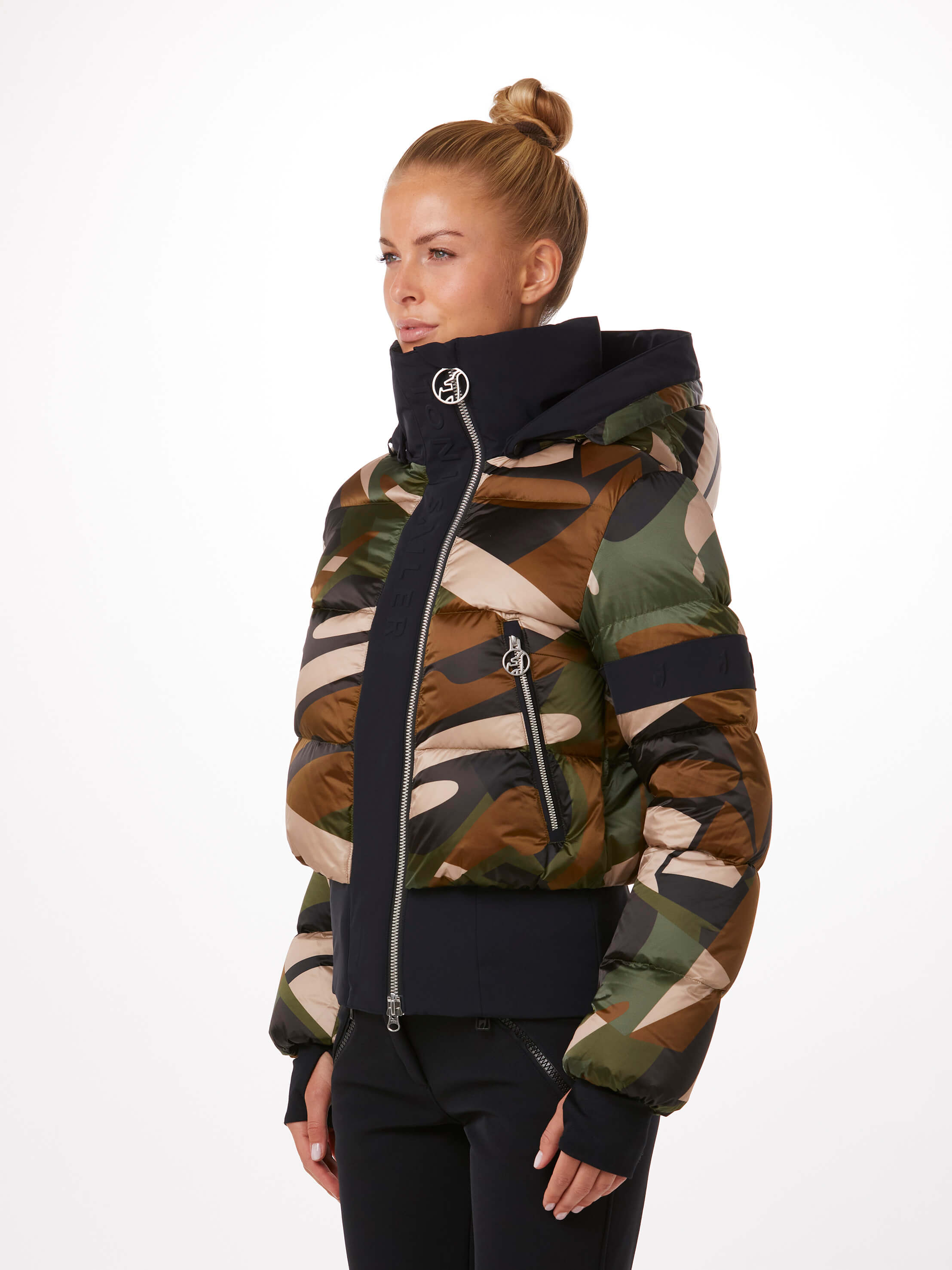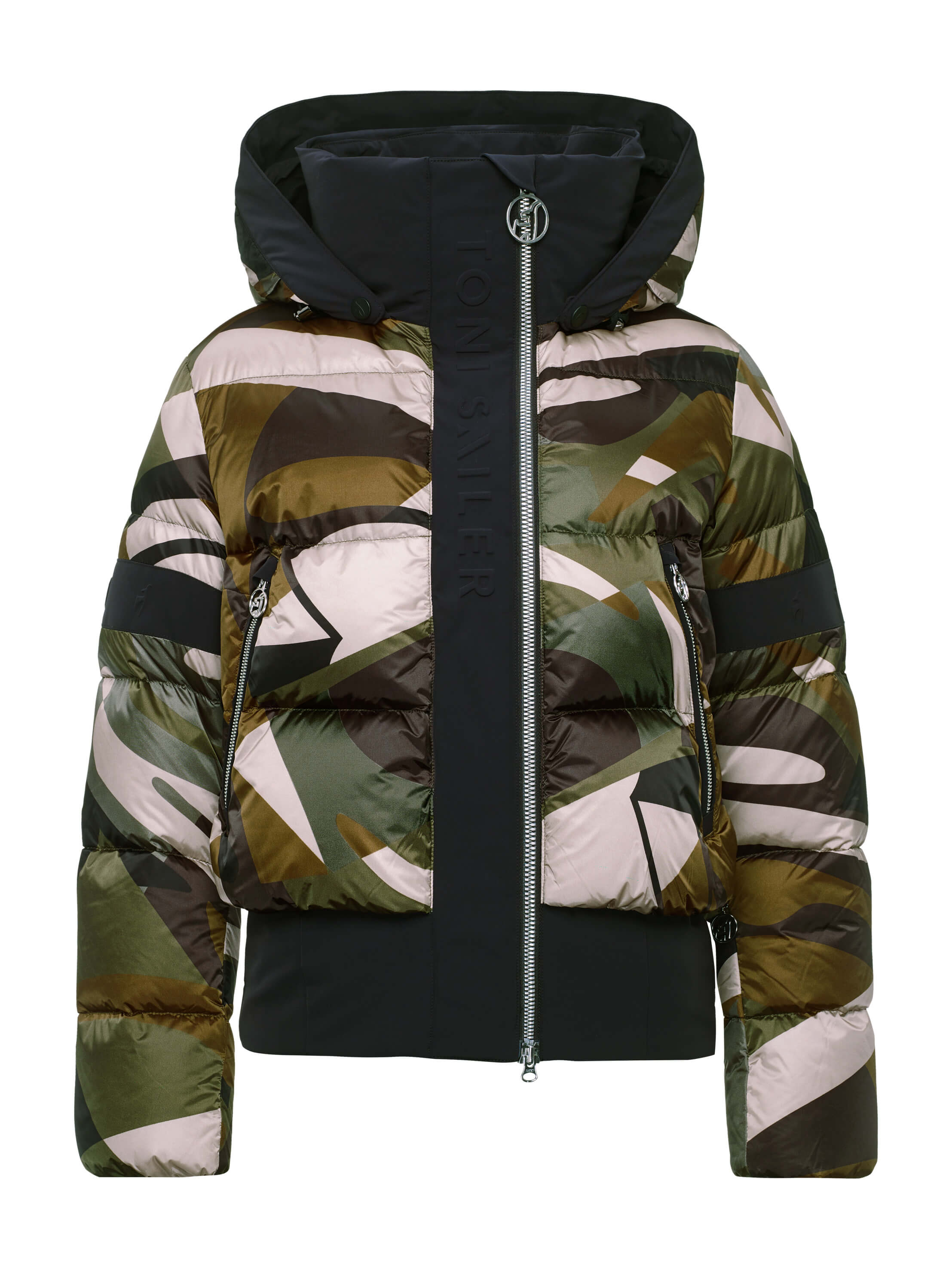 The PFAS-free LORETTA PRINT women’s ski jacket is a fashionable highlight in a short puffy jacket look with a cool, interpreted camo print. An excellent down filling with stabilizing feathers ensures long-lasting volume and high thermal performance. The Shiny Pearl Nylon fabric gives the jacket its shine, while Japanese Premium 4-way Stretch increases comfort and ensures a perfect fit. This high-performance ski jacket features a side-offset 2-way METALUXE® mirror zipper and a vertical molded Toni Sailer logo on the front.