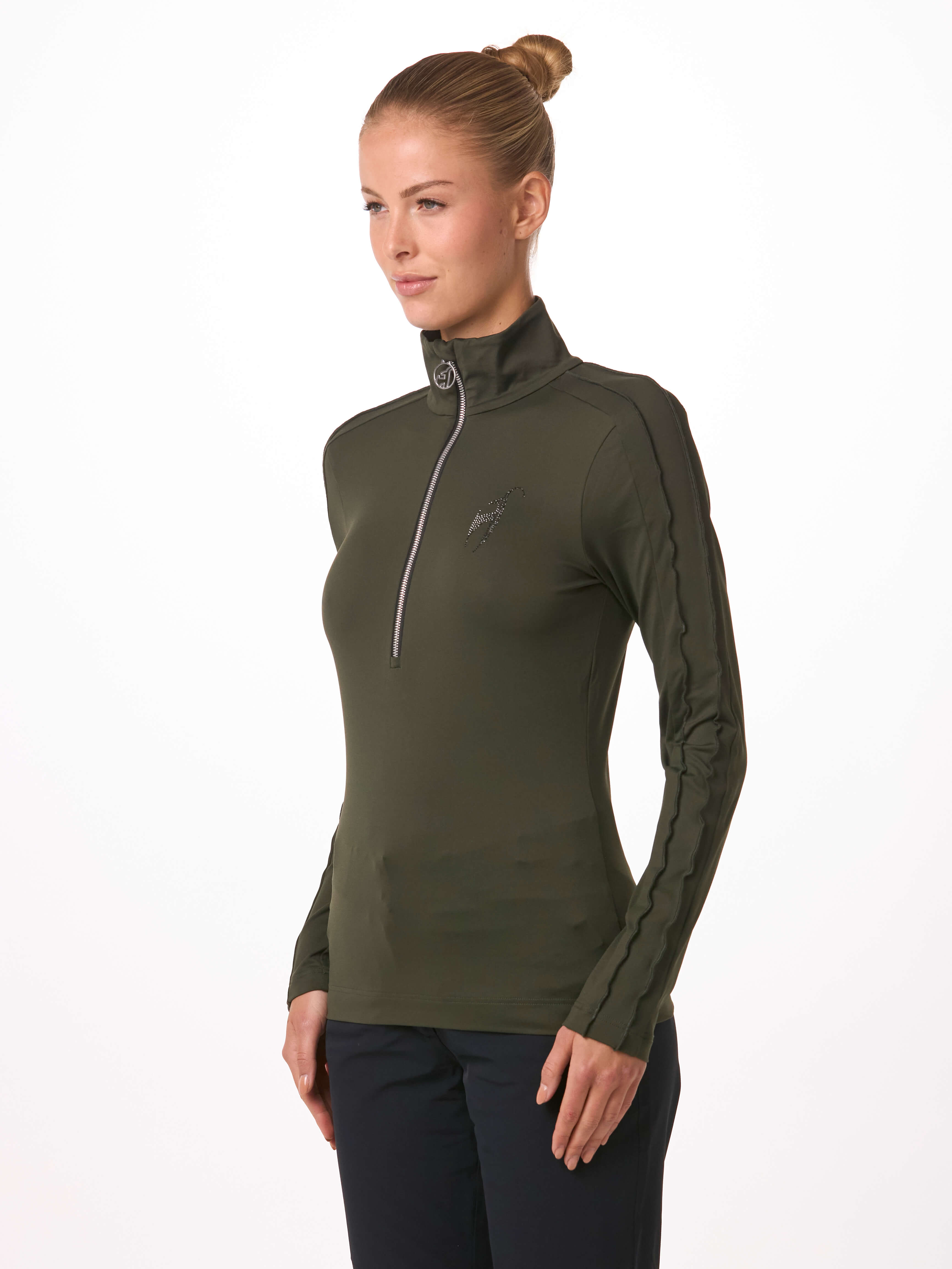 Swarovski® crystals make you shine bright! The VRENI SPECIAL with specially worked ruffles on the sleeves. Our first layer fabric provides warmth, coziness and 100% freedom of movement. Glamorous look on the slopes and chalets.